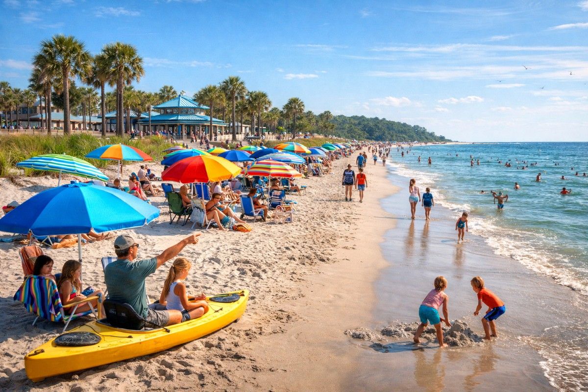 Coligny Beach is one of the most popular beaches with beautiful blue water, soft sand, and great amenities like swings, fountains, and boardwalks.